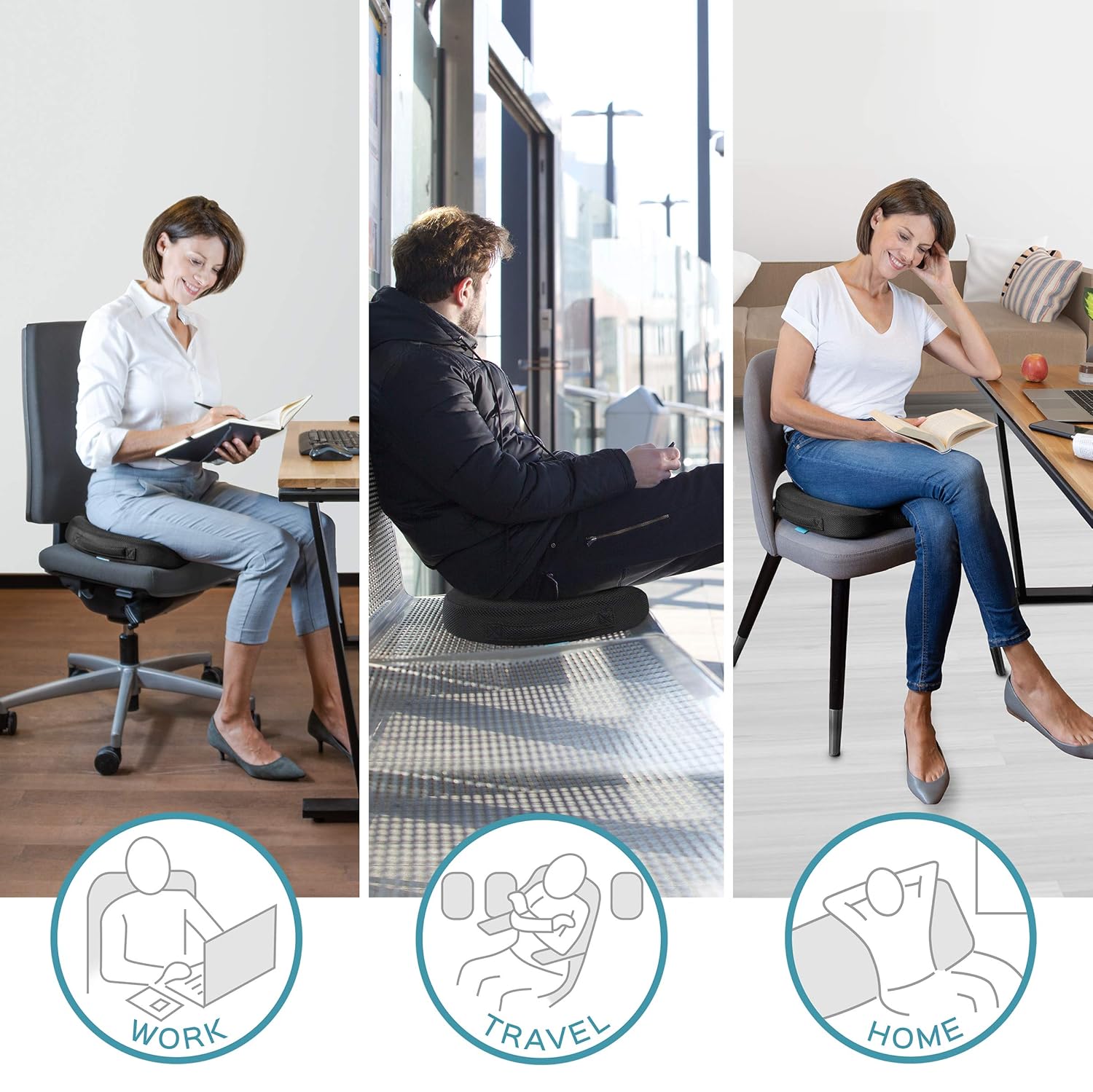 Our cushion balances the pelvis, relaxes hip flexors & reduces tension on the tailbone, hips, and spine, turning any chair into an ergonomic and pain-relieving seat.